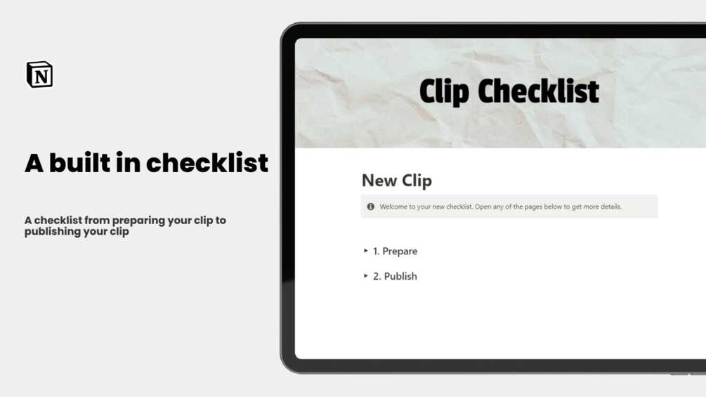 • Streamlined Workflow: Create premade checklists to track titles, descriptions, hashtags and social media posting status, helping you stay organised and focused on creating engaging content.
